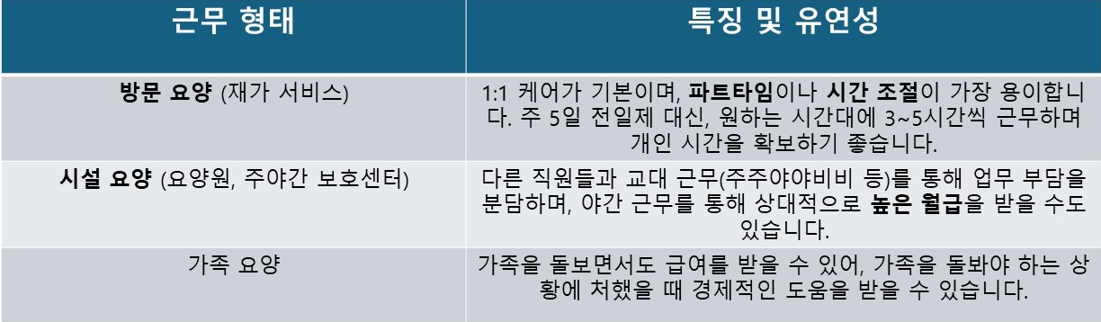 요양보호사는 근무하는 장소와 방식에 따라 근무 형태를 유연하게 선택할 수 있다는 큰 강점이 있습니다.